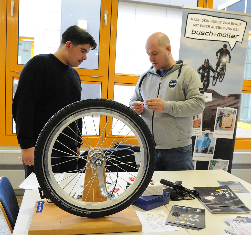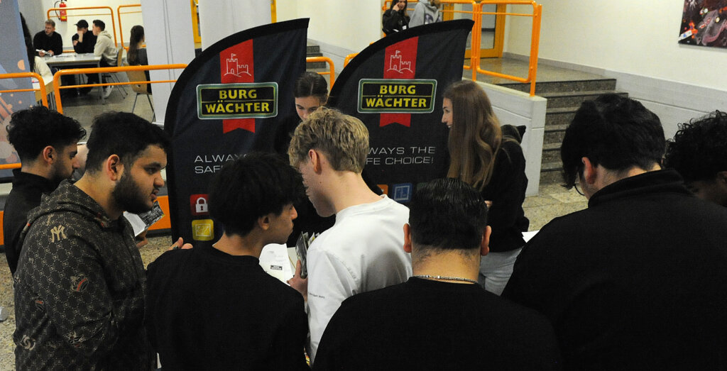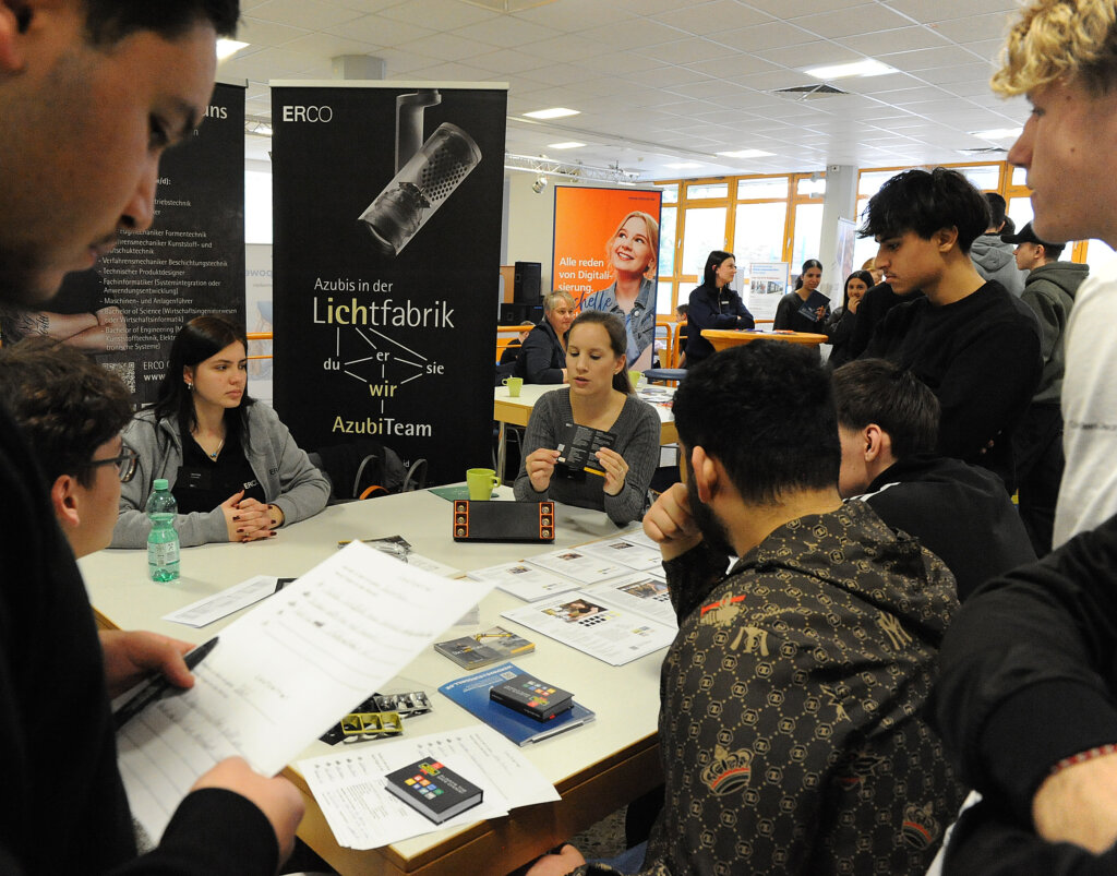 Die Berufsorientierung ist gerade für die älteren Schüler der Rothensteinschule ein wichtiger Punkt im Schulleben. Da bot die schulinterne Ausbildungsbörse am Donnerstag, 5. Februar, eine gute Gelegenheit, mit potenziellen Ausbildungsbetrieben in Kontakt zu kommen. Elf Unternehmen und das TUMO-Center Lüdenscheid waren der Einladung der Schule gefolgt und präsentierten sich und ihre Ausbildungschancen im Rahmen einer kleinen Messe in der Aula.