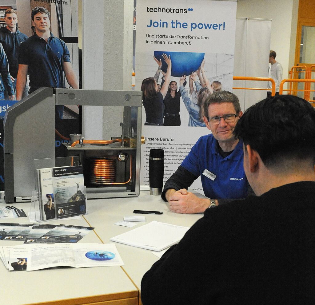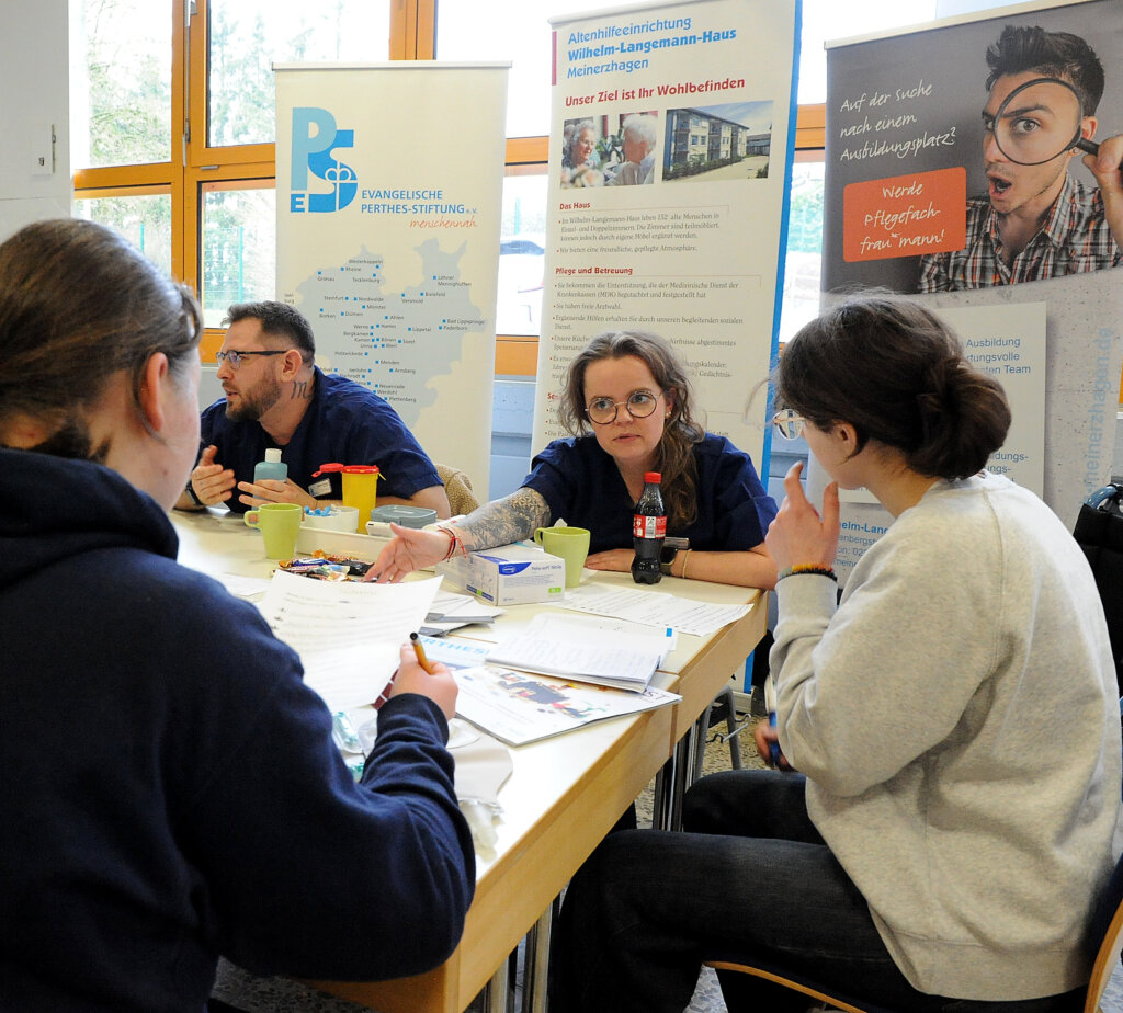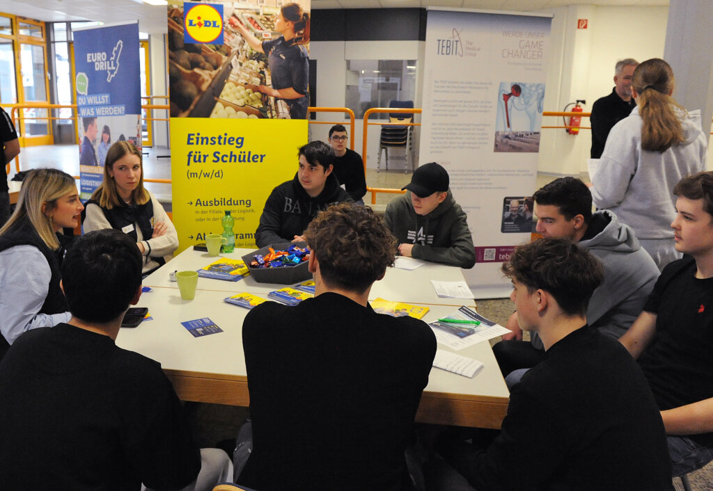 Alle Schülerinnen und Schüler der Jahrgänge 8, 9 und 10 kamen nacheinander für eine Stunde in die Aula und konnten sich dort völlig zwanglos mit den Vertretern der Firmen unterhalten. Die hatten sowohl Ausbilder als auch Auszubildende geschickt – teilweise ware auch ehemalige Schüler der Rothensteinschule dabei. Die jetzigen Schülerinnen und Schüler informierten sich über alle möglichen Ausbildungsberufe; einige gaben sogar ihre vorbereiteten Bewerbungsunterlagen ab. So war es kein Wunder, dass am Ende des Tages beide Seiten ein positives Fazit zogen.